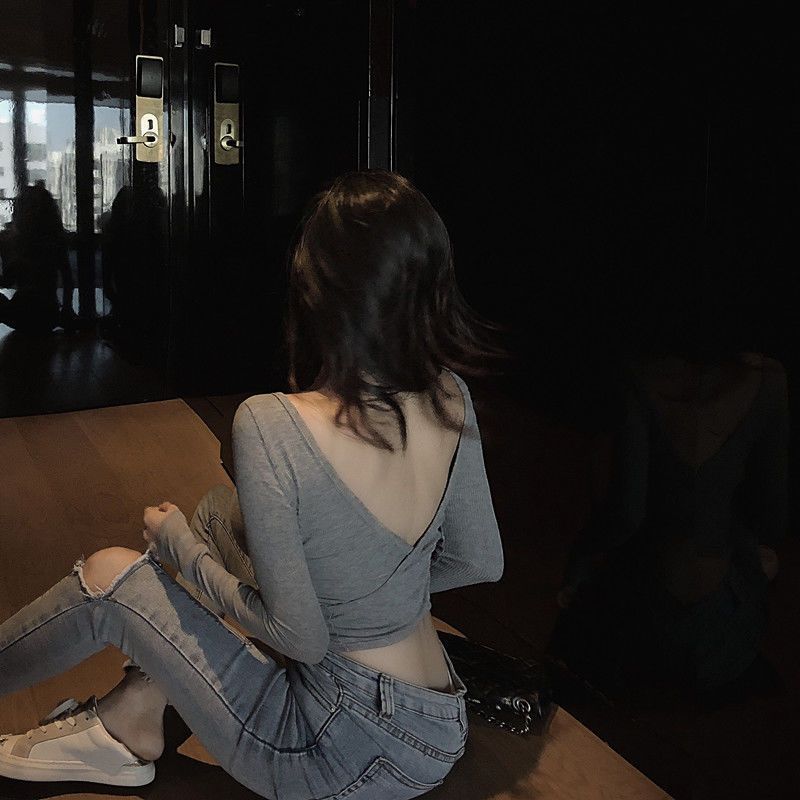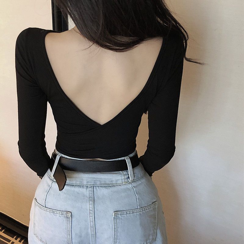 Back-exposed Long-sleeved T-shirt for Women - Autumn Skinny V-neck Cropped Top