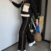Color Matching Long Sleeve Top Elastic Waist All-matching Straight Trousers Ladies Two-piece Set