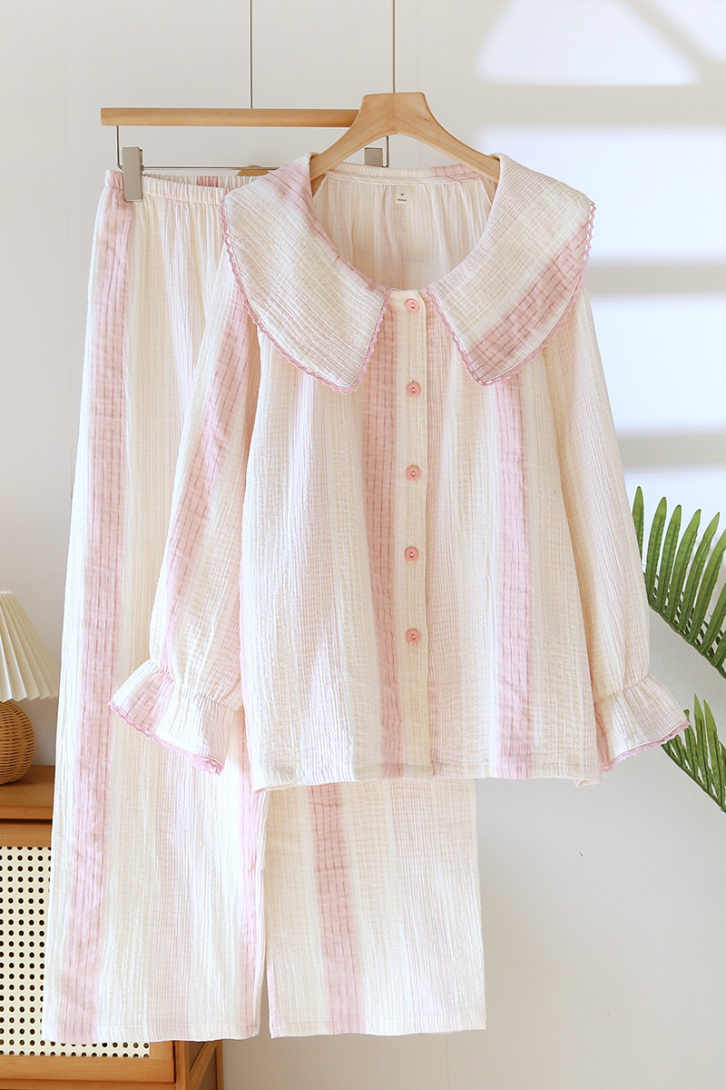 Contrast-color Doll Collar Long-sleeved Trousers Homewear Suit.