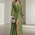 Flower Chiffon Wedding Dress with Long Puff Sleeves and V-neck - Flowy Maxi Dress