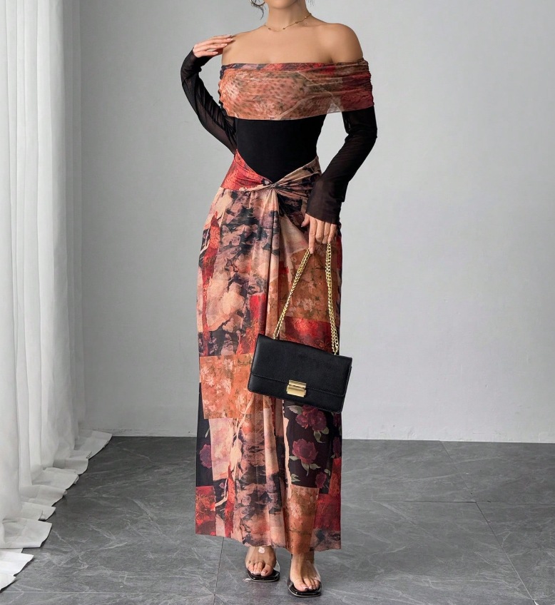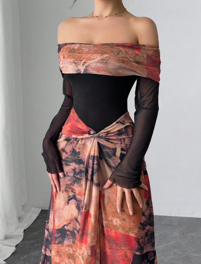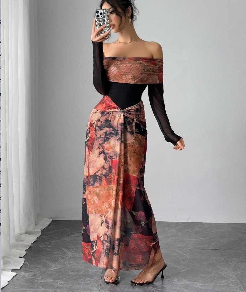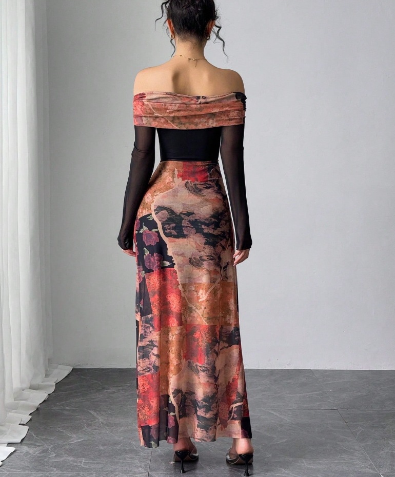 French One-Shoulder Mesh Dress with Swing Collar and Print