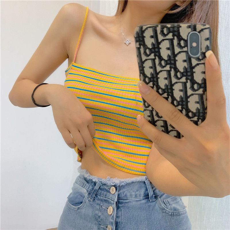 Korean Style Short Western Style Slim Fit Striped Bottoming Shirt in yellow and green stripes, perfect for casual fashion.