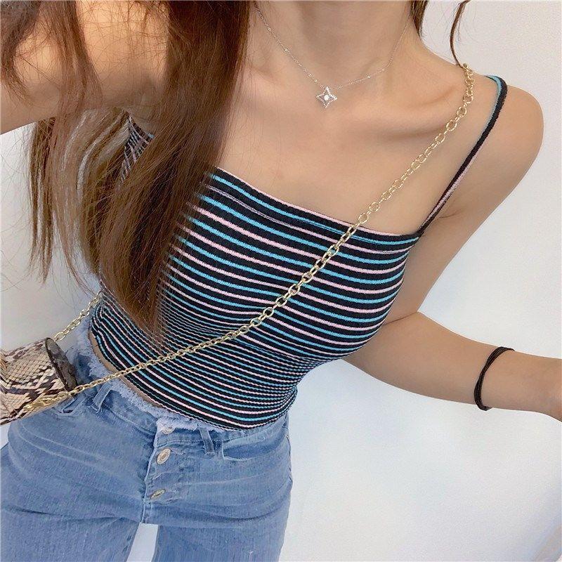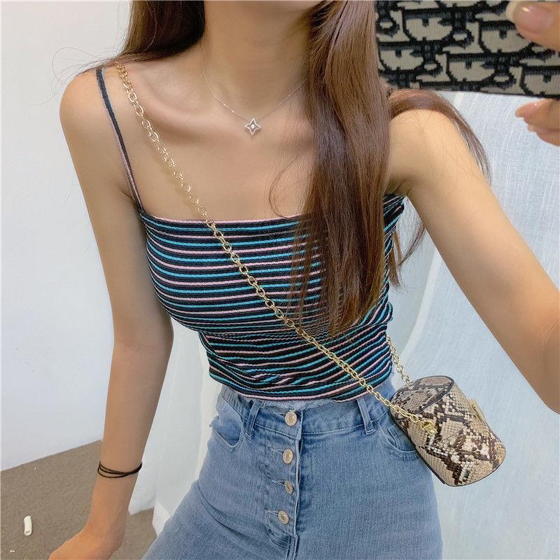 Korean Style Short Western Style Slim Fit Striped Bottoming Shirt worn with jeans and a chain strap bag