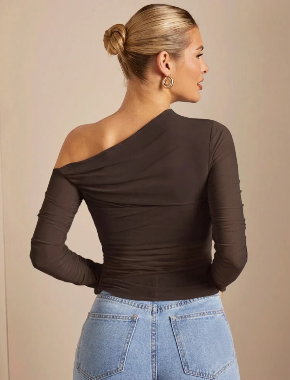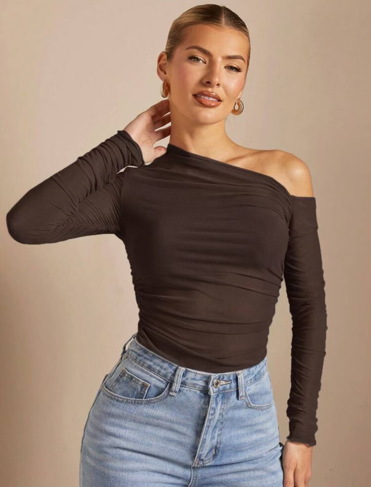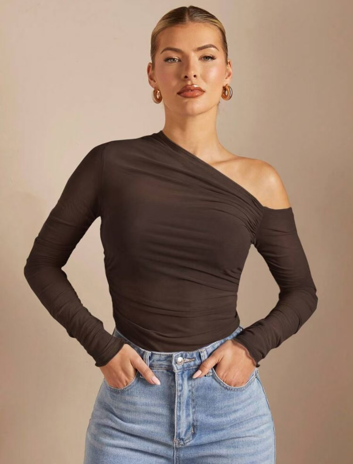 One-Shoulder Slim Mesh Top for Women - Long Sleeve Pleated Cross-Body Design