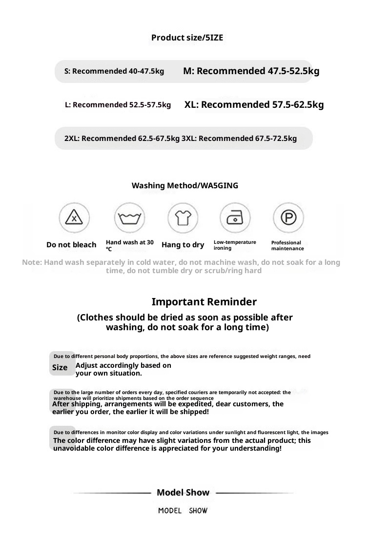 Note: 1. Asian sizes are 1 to 2 sizes smaller than European and American people. Choose the larger size if your size between two sizes. Please allow 2-3cm differences due to manual measurement. 2. Please check the size chart carefully before you buy the item, if you don't know how to choose size, please contact our customer service. 3.As you know, the different computers display colors differently, the color of the actual item may vary slightly from the following images.